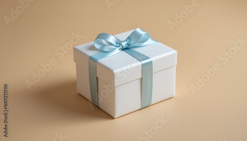 A neatly wrapped white gift box is adorned with a soft blue ribbon and bow on beige background.
