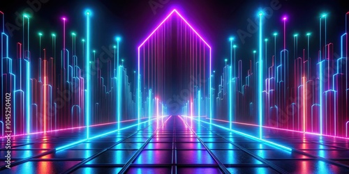 A neon cityscape with a glowing path leading towards a glowing geometric frame in the distance. The path is bordered by rows of neon skyscrapers.