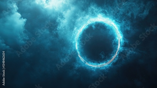 A neon laser geometric cyber circle shines against a dark blue backdrop, enveloped in smoke and smog.