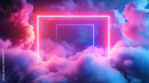 A neon pink square frame is surrounded by pink and blue smoke.