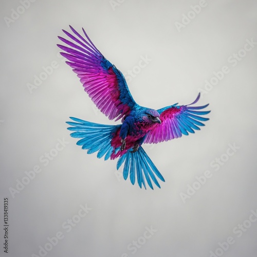 "A neon-colored bird in mid-flight, its feathers glowing with vivid hues of electric blue, neon pink, and radiant purple. The intricate details of its wings are illuminated with a soft, otherworldly g