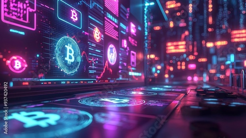 A neon-lit financial hub where digital currencies are crumbling on holographic displays, representing the fragility of future investments