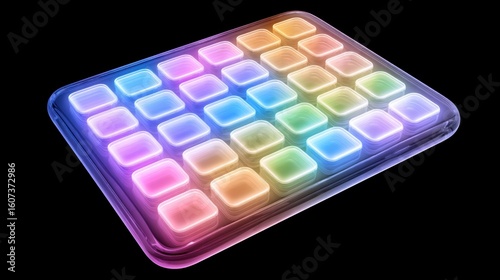 A neon-lit grid of colorful, translucent square buttons arranged in a rectangular layout on a black background, tablet app icons