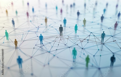 A network of colorful human figures connected by lines and nodes, representing relationships in a social or professional context on white background.