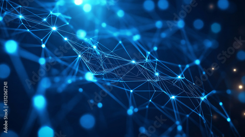 A network of interconnected glowing blue lines forming a complex network. This abstract background symbolizes technology, data exchange, artificial intelligence, and blockchain innovation.