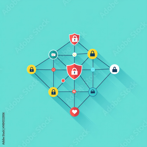 A network of people with a red shield in the middle. The shield is surrounded by a blue background