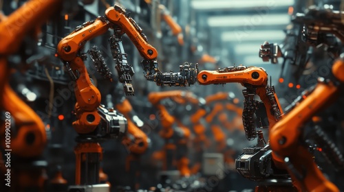 A network of robotic arms works in unison to assemble various components in a modern industrial facility, showcasing precision and efficiency