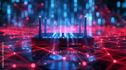 A network router emitting strong Wi-Fi signals, with devices connecting wirelessly