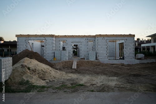 A new house is under construction in a residential area, featuring aerated concrete blocks and piles of sand to facilitate the building process and foundation work