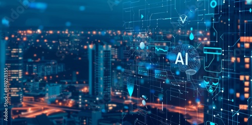 A New York skyline with AI brain holograms, futuristic technologies, and icons