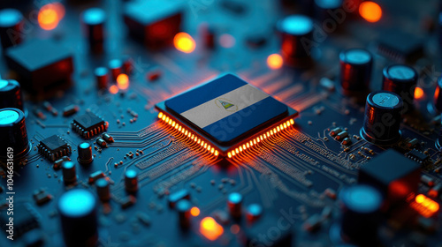 A Nicaragua flagged microchip is centered on a circuit board, surrounded by illuminated components, symbolizing role in semiconductor innovation and technology leadership.