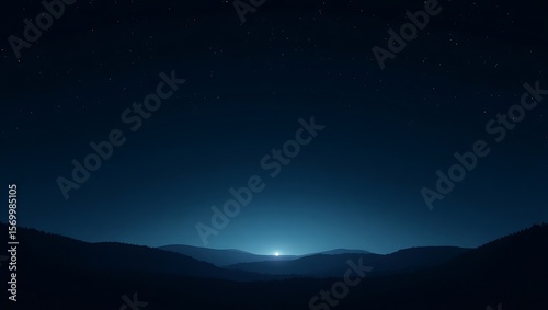 A night scene featuring mountains under a starry sky with a faint light on the horizon line