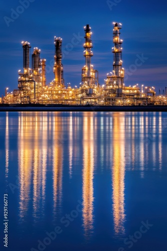 A night view of a crude oil refining complex, with lights illuminating the facility and showcasing demand-driven production, reflecting growth in the energy sector.