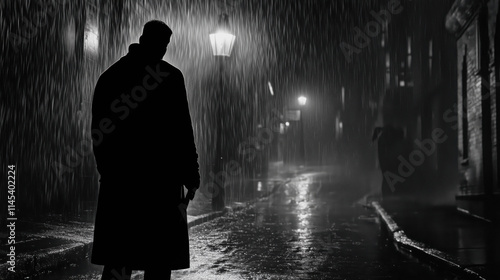 A noir shot of a killer facing away, holding a knife in one hand in a dim streetlight.