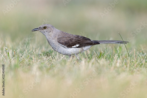 A Northern Mockingbird (Mimus polyglottos) foraging in a park in the grass in the morning light
