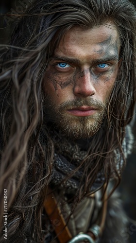 A Norwegian man with flowing hair and blue eyes in epic portrait style. Gorgeous man with complex costumes and penetrating gaze in shades of gray.