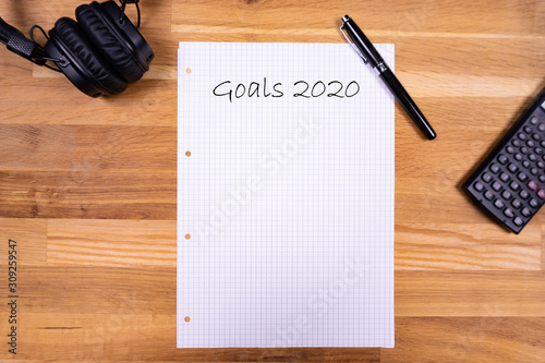 A notepad with a note saying "Goals 2020" together with a pen, a calculator and headphones on a wooden table