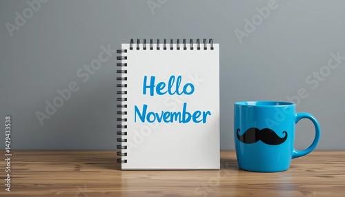 A notepad with hello November and a blue mug with a mustache on a wooden surface against a gray wall
