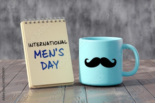 A notepad with International Mens Day written on it next to a blue mug with a black mustache.