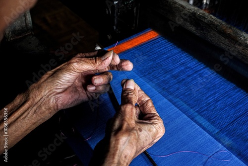 a old lady is weave a Samarinda sarong in Kampong Tenun, Samarinda
