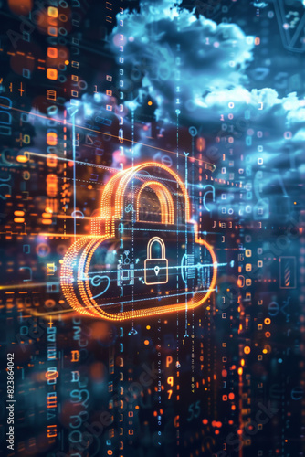 A padlock icon hovering in the center with a cloud shape in the background, surrounded by digital shields and encrypted codes, signifying robust cloud security and data protection.