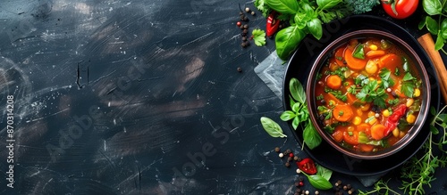 A painted stewpan loaded with organic vegetables, spices, and herbs for blending creamy soup against a black chalkboard backdrop. Top view featuring a copy space image for a vegetarian, vegan, detox,