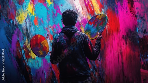 A painter with paint splattered on them, holds paint trays.