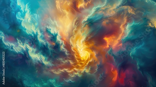 A painting depicting vibrant and colorful clouds floating in a clear blue sky