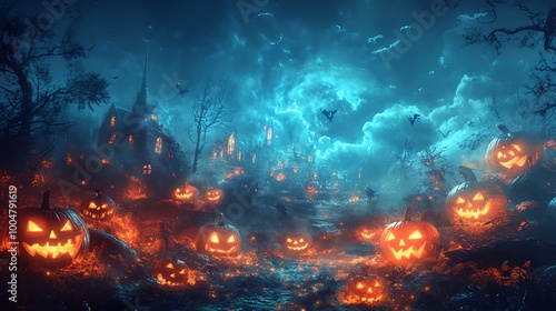 a painting of a halloween scene with pumpkins in the foreground and a castle in the background with a dark sky