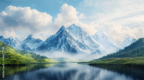 a painting of a mountain range with a lake in the foreground