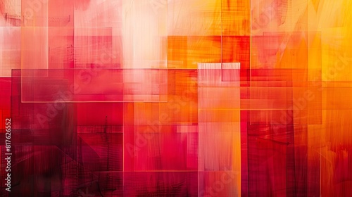 A painting of a red and orange background with squares of different colors. The painting is abstract and has a lot of texture
