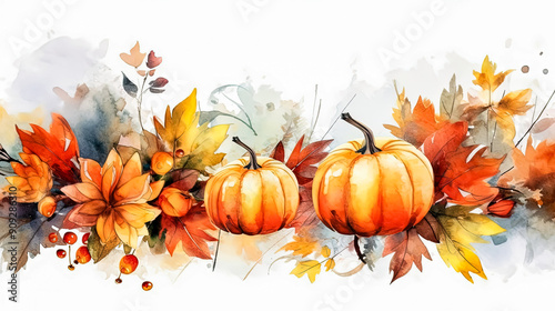 A painting of three pumpkins and leaves with a white background.