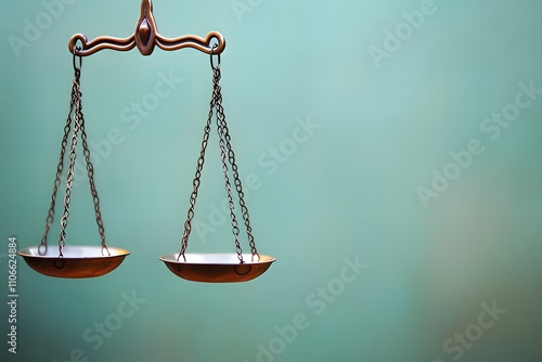 A pair of antique bronze scales hangs against a soft green background, symbolizing balance and justice.