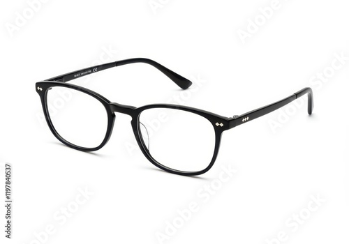 A pair of black-rimmed eyeglasses displayed at an angled view to emphasize the design of the frames and the lenses isolated on white background