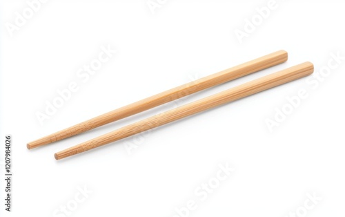 A pair of chopsticks made of natural bamboo with a smooth finish lying parallel on a solid white background, single object