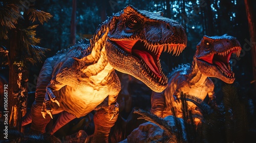 A pair of dinosaurs stand in a darkened forest lit by an orange light.