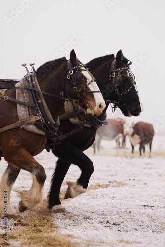 A pair of draft horses pull together in a field on a winter day