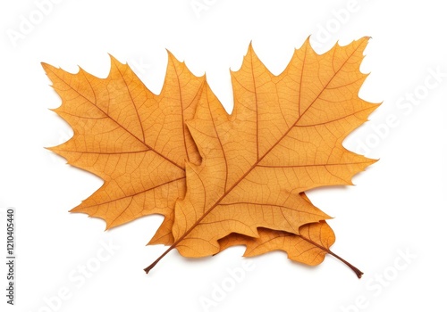 A pair of dried oak leaves with a warm orange-brown hue, showing their textured veins and natural edges isolated on white background