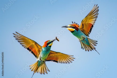 A pair of elegant European bee-eaters catching insects in mid-flight, with a blue sky background.