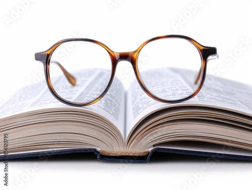 A pair of eyeglasses on top of an open book, realistic photo, clipping path, isolated on white background
