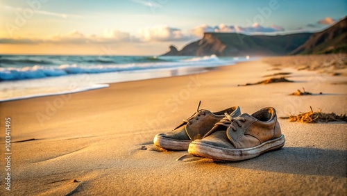 A pair of forsaken shoes on an empty beach, representing journeys left behind and the untrodden paths that life often casts aside.