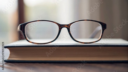 A pair of glasses rests on an open book, hinting at reading and knowledge in a cozy, softly lit environment.