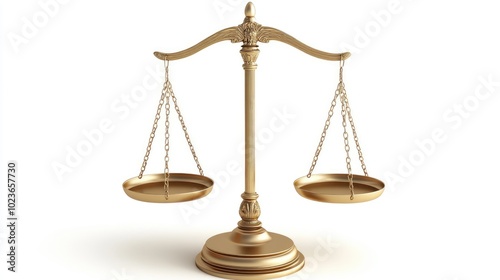 A pair of golden scales with one side tilted slightly higher, isolated on a white surface, representing law. No people.
