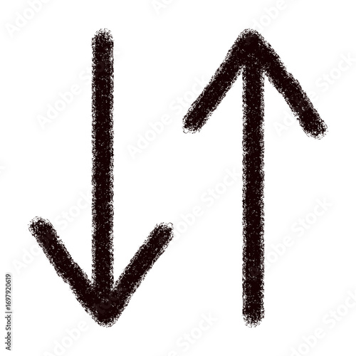 A pair of hand-drawn black arrows, one pointing up and one down, with a rough, crayon-like texture on a white background.