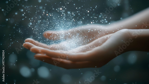 A pair of hands gently holds a sparkling shimmer, capturing the essence of light and magic in a tranquil moment.