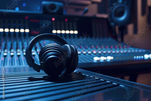 A pair of high-end headphones placed on a mixing console in a dimly lit recording studio, creating a focused and professional atmosphere