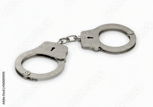 A pair of open, silver metal police handcuffs with a connecting chain, isolated against a white background.