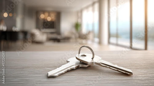 A pair of silver keys rests on a wooden table in a modern, bright apartment with large windows and contemporary decor