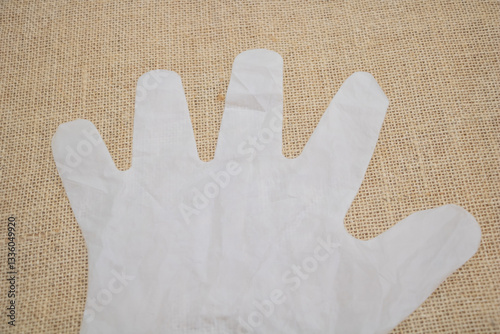 A pair of white plastic hand gloves on top of burlap fabric, in a flat lay, close-up view