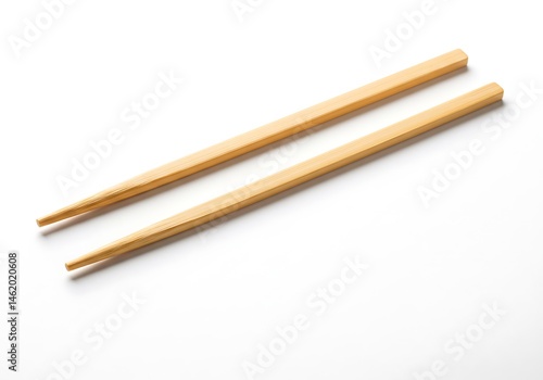 A pair of wooden chopsticks lying parallel on a white surface in a simple and clean presentation